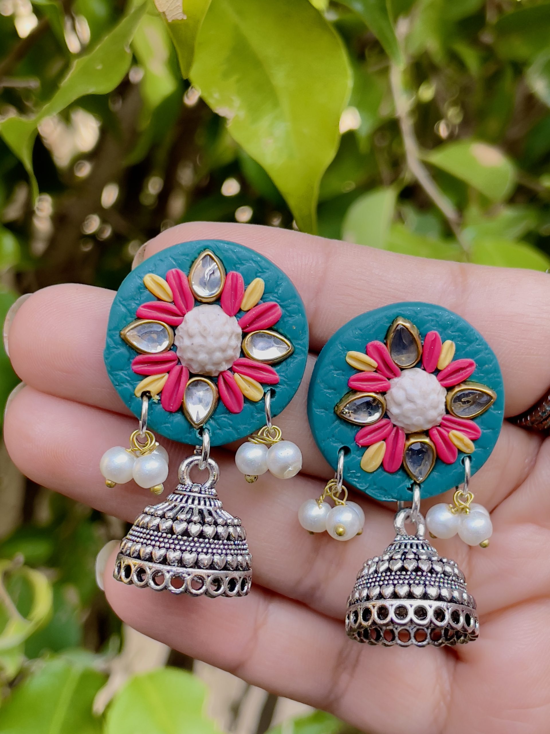 ⚠️ Note: Please be aware that the Jhumka bell shape may vary slightly depending on stock availability; however, the turquoise base, floral colors, and overall design will remain exactly as shown.