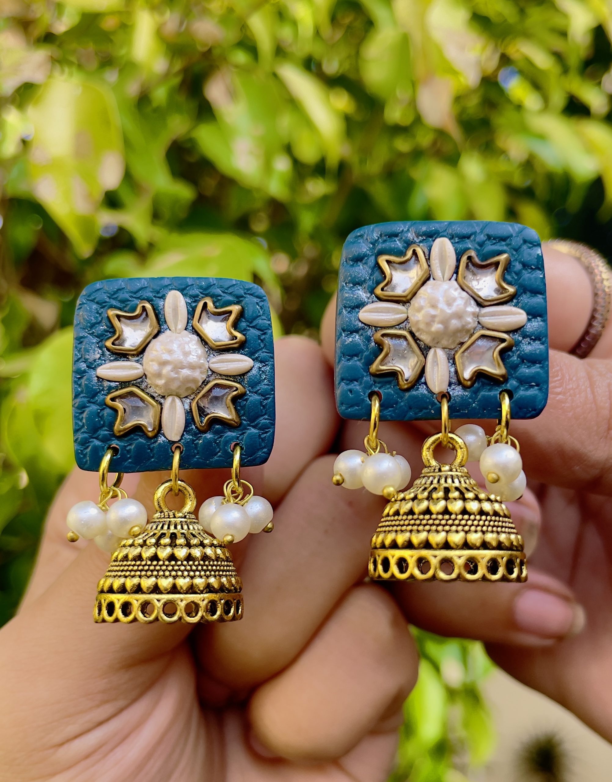 ⚠️ Note: The Jhumka bell shape may vary slightly depending on stock availability; however, the primary deep teal color, square design, and overall aesthetic will remain exactly as shown.