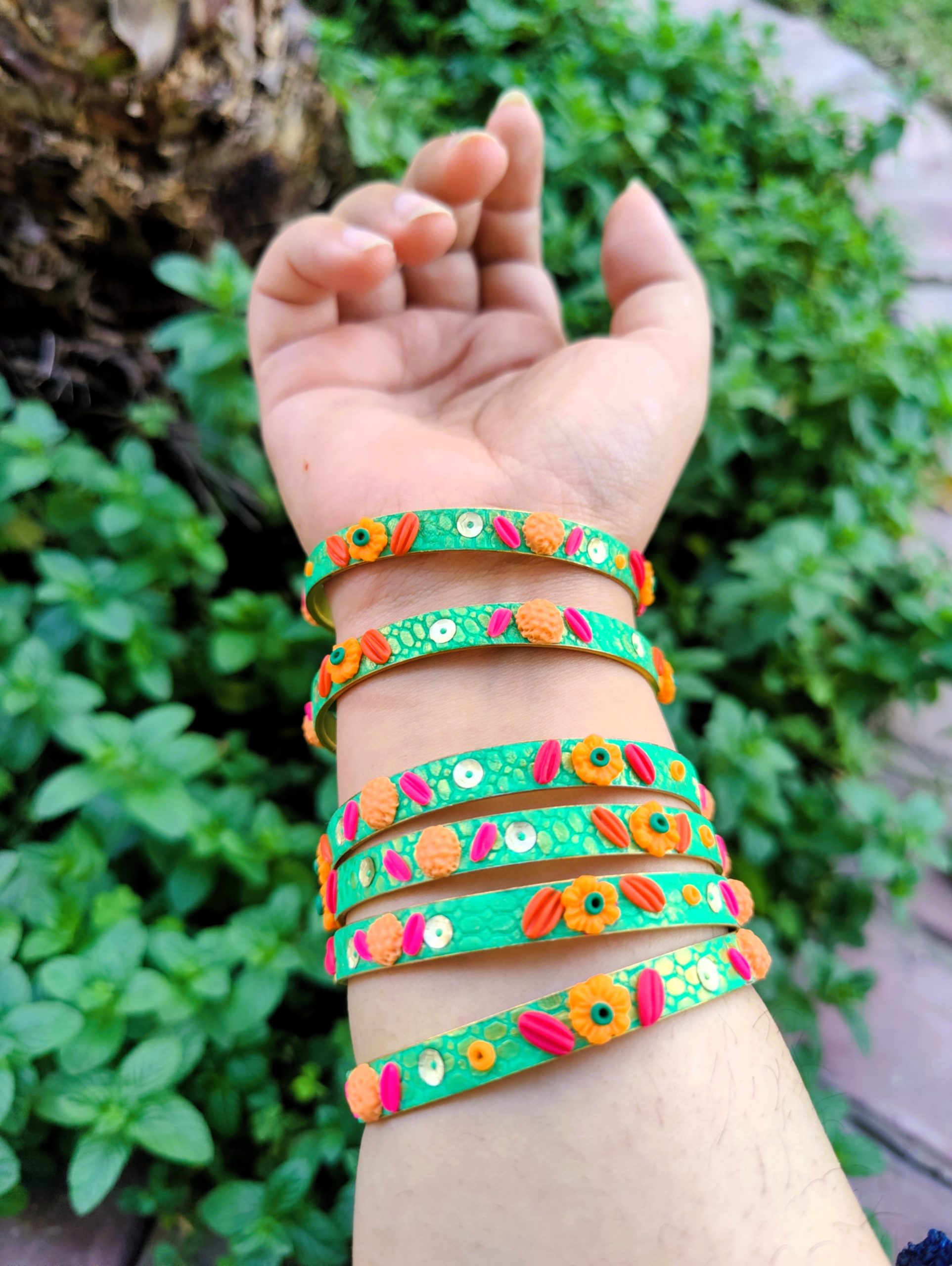Make a statement with our Lush Meadow Floral Bangle Stack. These handcrafted bangles feature a rich emerald green textured base adorned with a whimsical arrangement of 3D sculpted clay flowers in orange and pink. Detailed with shimmering silver paillettes, this stack is the perfect blend of bold color and intricate artisan detail.
