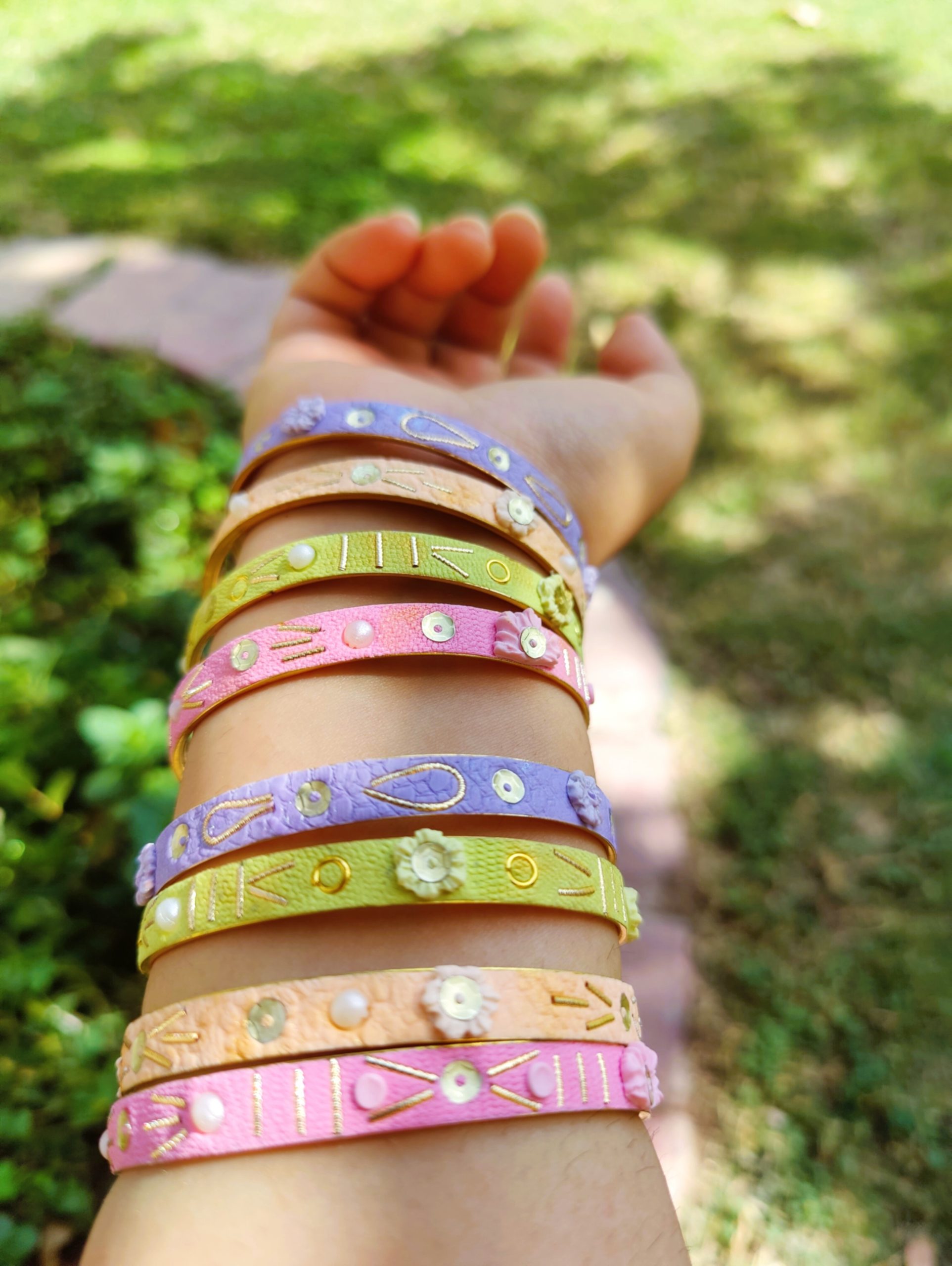 Experience the soft side of artisan jewelry with our Pastel Dream Floral Bangle Stack. This handcrafted set features a beautiful assortment of textured bands in lilac, mint, peach, and pink. Each piece is meticulously decorated with 3D clay blooms, gold-wire embroidery, and delicate pearl accents. Perfect for bridesmaids, spring festivals, or adding a gentle pop of color to your everyday wardrobe.