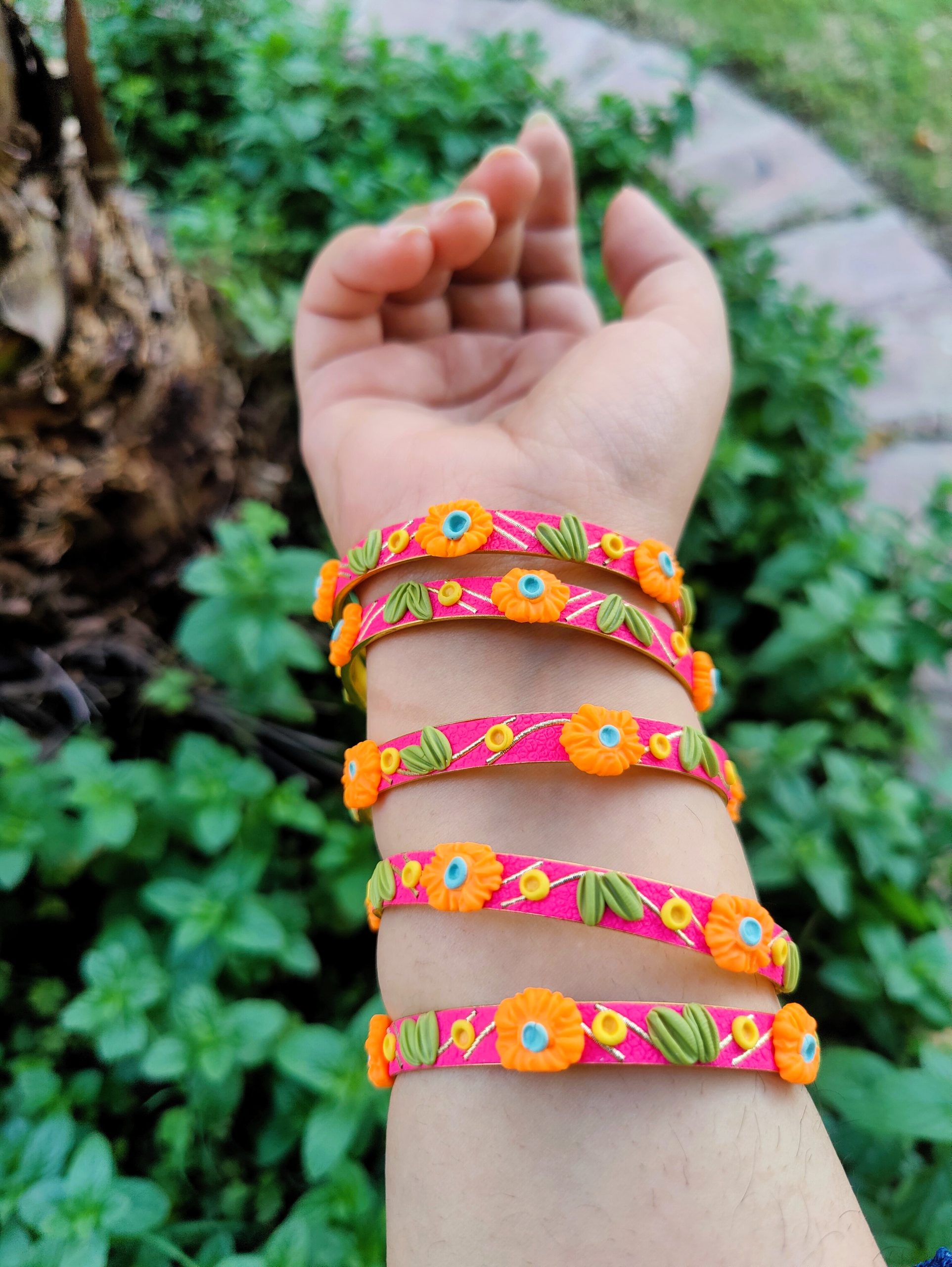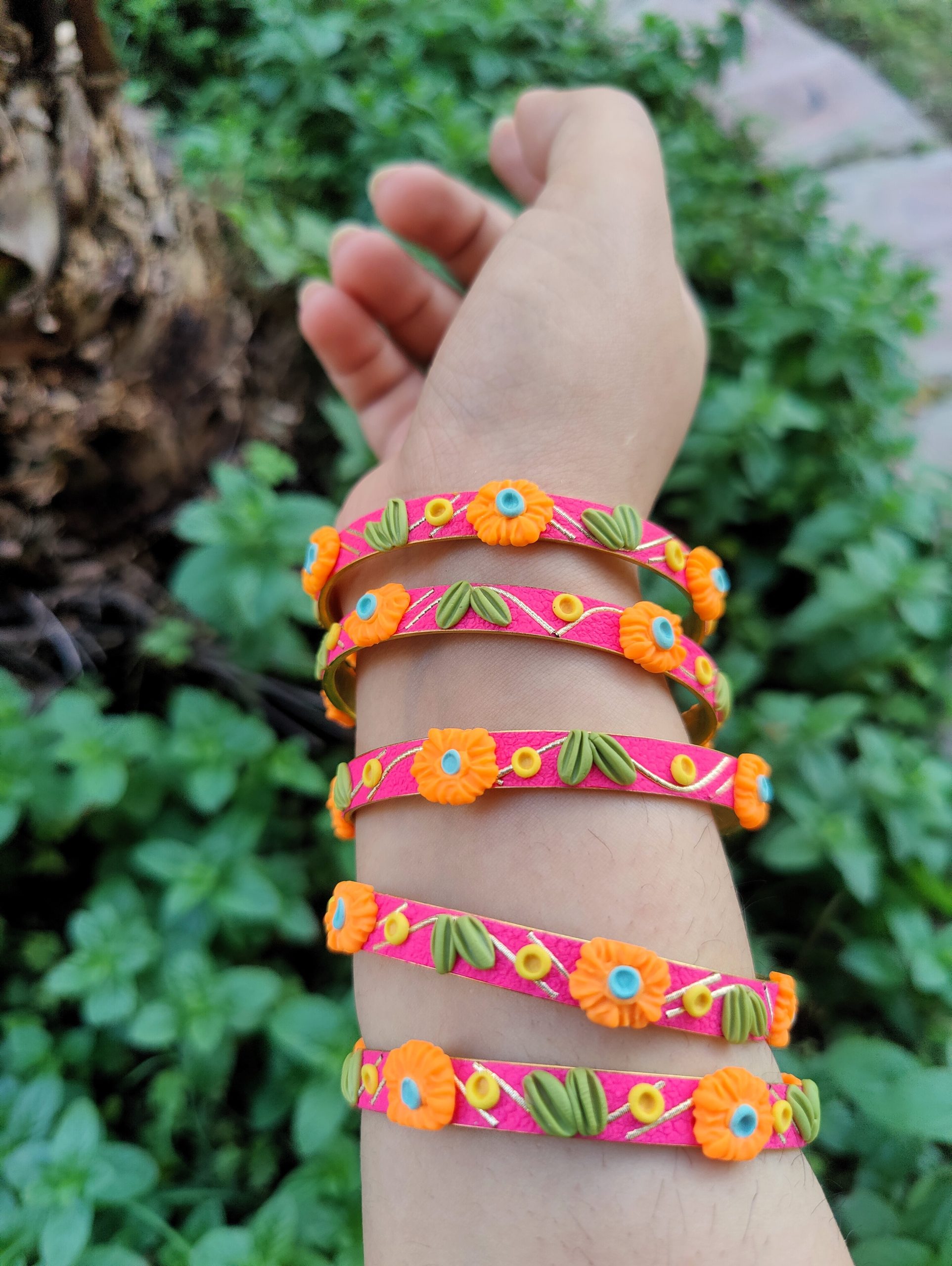 Step into summer with our Pink and Orange Floral Bangle Stack. These artisan-made bangles feature a brilliant magenta textured base adorned with hand-sculpted orange blooms and delicate gold-wire embroidery. Lightweight and vibrant, this stack is designed to bring a joyful pop of color to your jewelry collection.