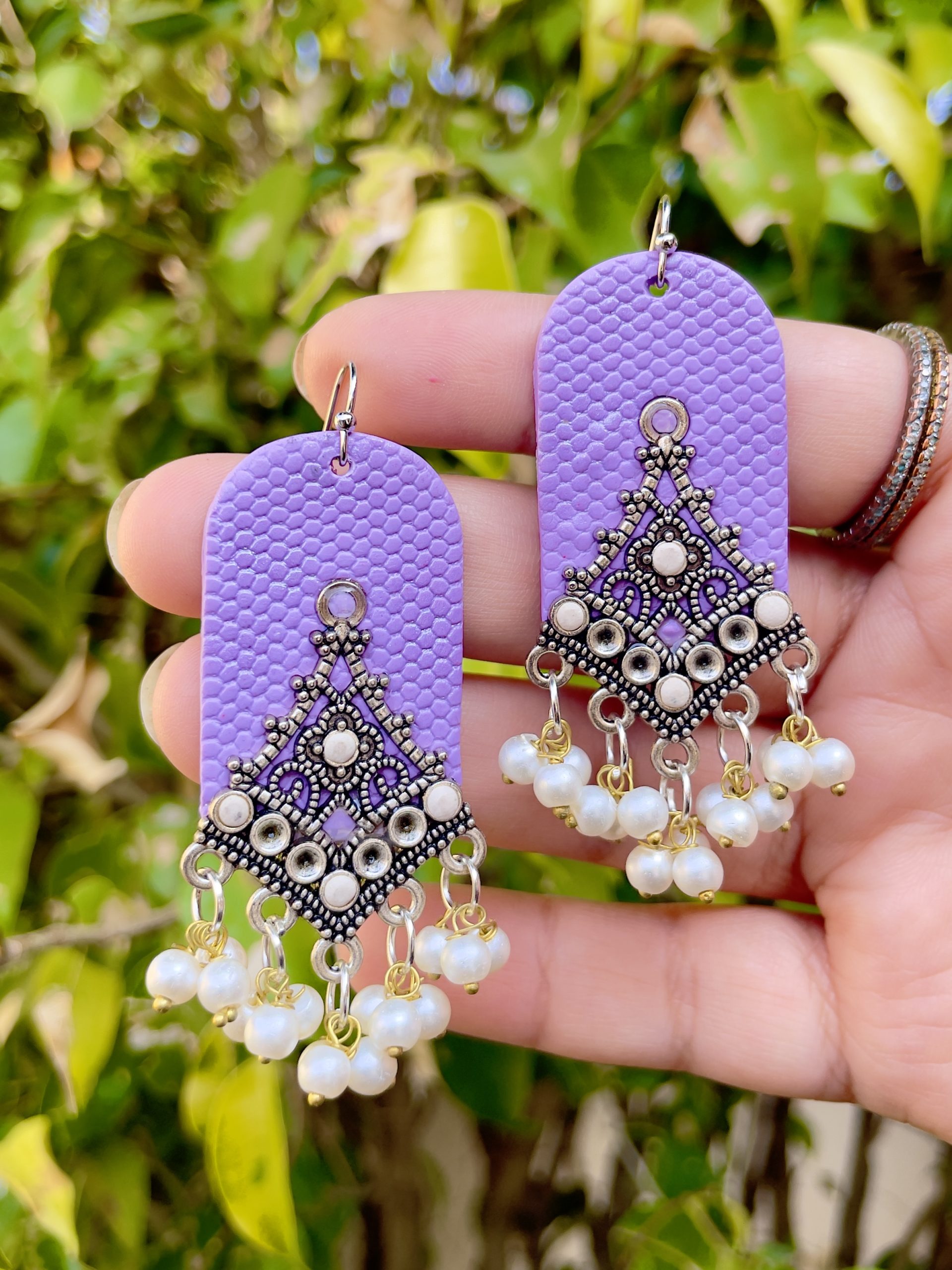 Embrace a touch of whimsical elegance with our Lavender Edition of these textured boho dangles. The soft, pastel purple hue offers a dreamy contrast to the antiqued silver metalwork, making these the perfect accessory for spring outfits, garden parties, or adding a pop of color to a cool-toned wardrobe.