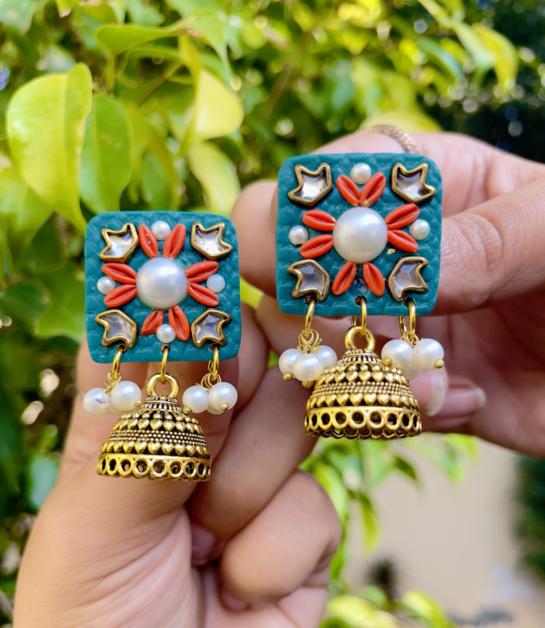 Infuse vibrant energy into your accessory collection with these Teal and Coral Square Jhumkas. Featuring a bold teal textured base and a striking pearl-centered floral design, these earrings offer a modern bohemian twist on traditional royalty.