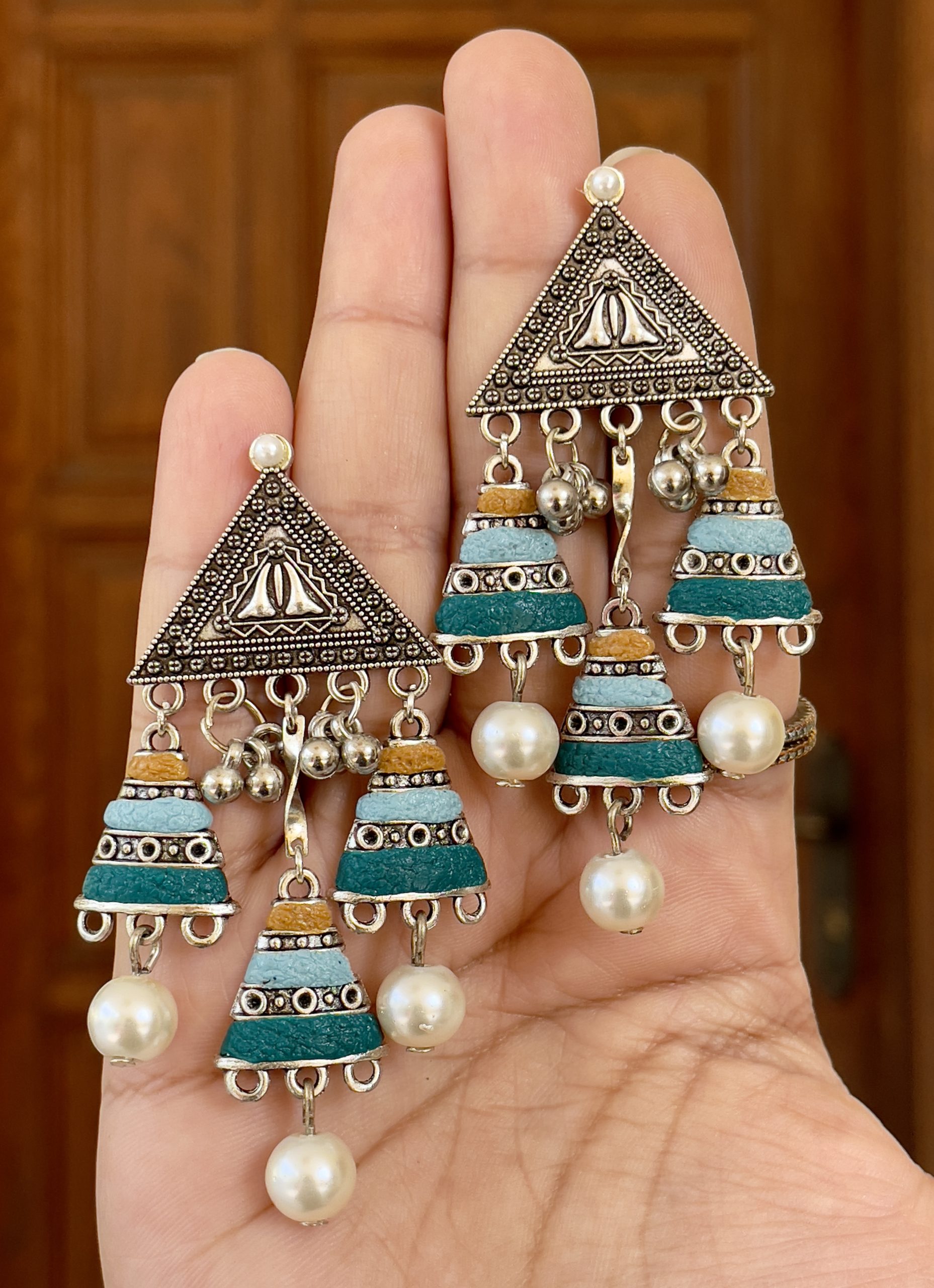 • Geometric Tribal Anchor: The top triangular stud is crafted from antiqued silver-toned metal, featuring traditional tribal craftsmanship and central pearl or mirror-style detailing.